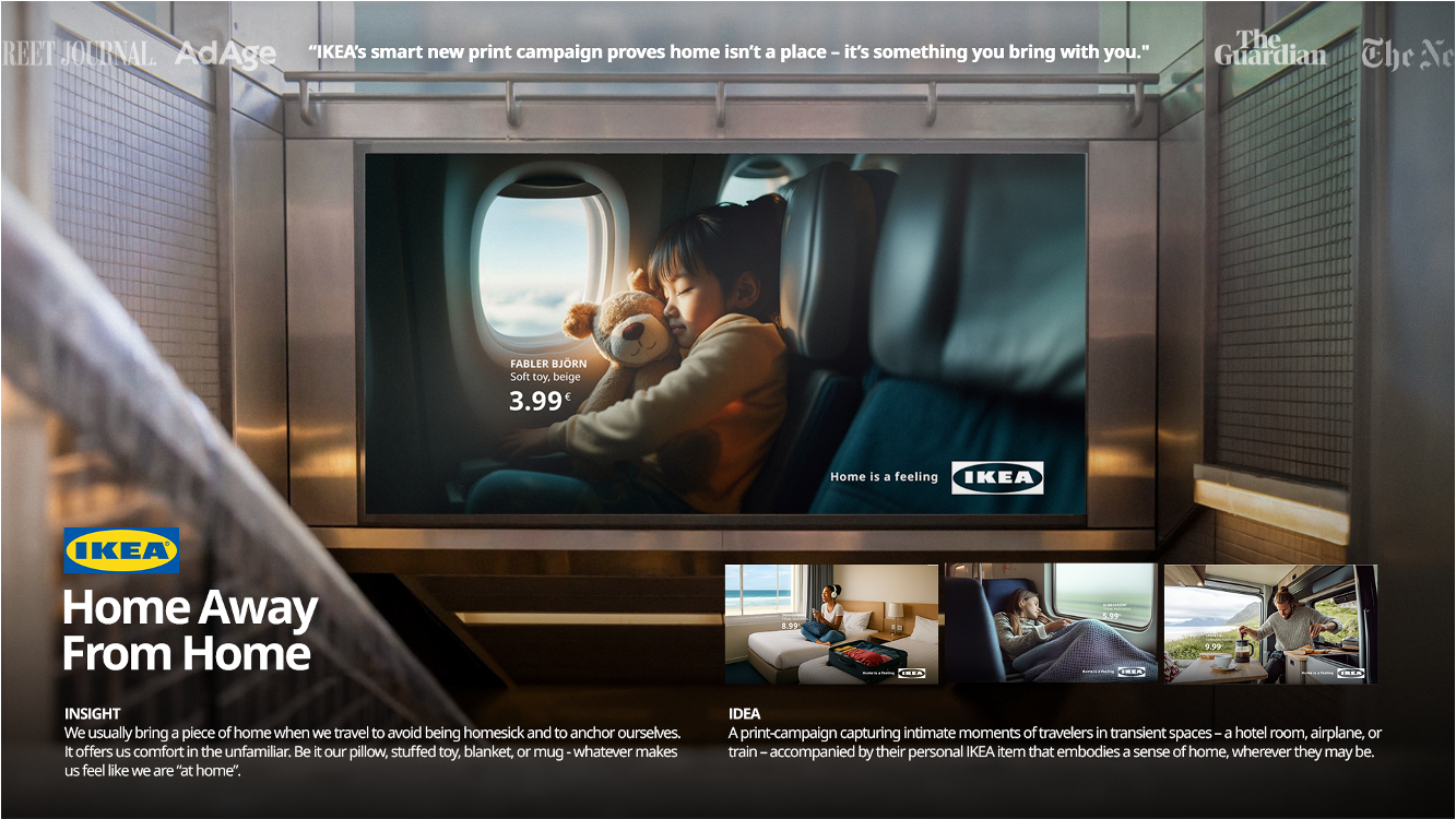 A simple idea born from a simple insight: the things we take from home when we travel aren’t just products—they’re anchors. They ground us, comfort us, and turn unfamiliar places into something familiar. This idea sparked when my art director went on a trip and noticed her cousin bringing her own pillow—a small, everyday item that carried the warmth of home, even far away. With IKEA, these objects become more than just things; they give you the feeling of home, wherever you go.